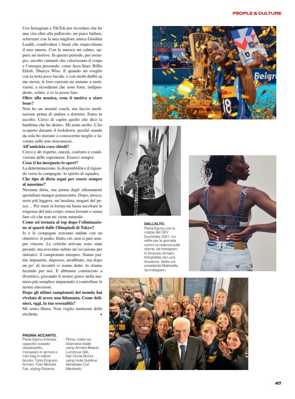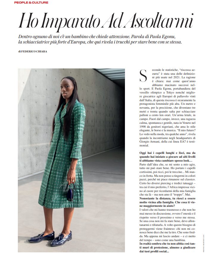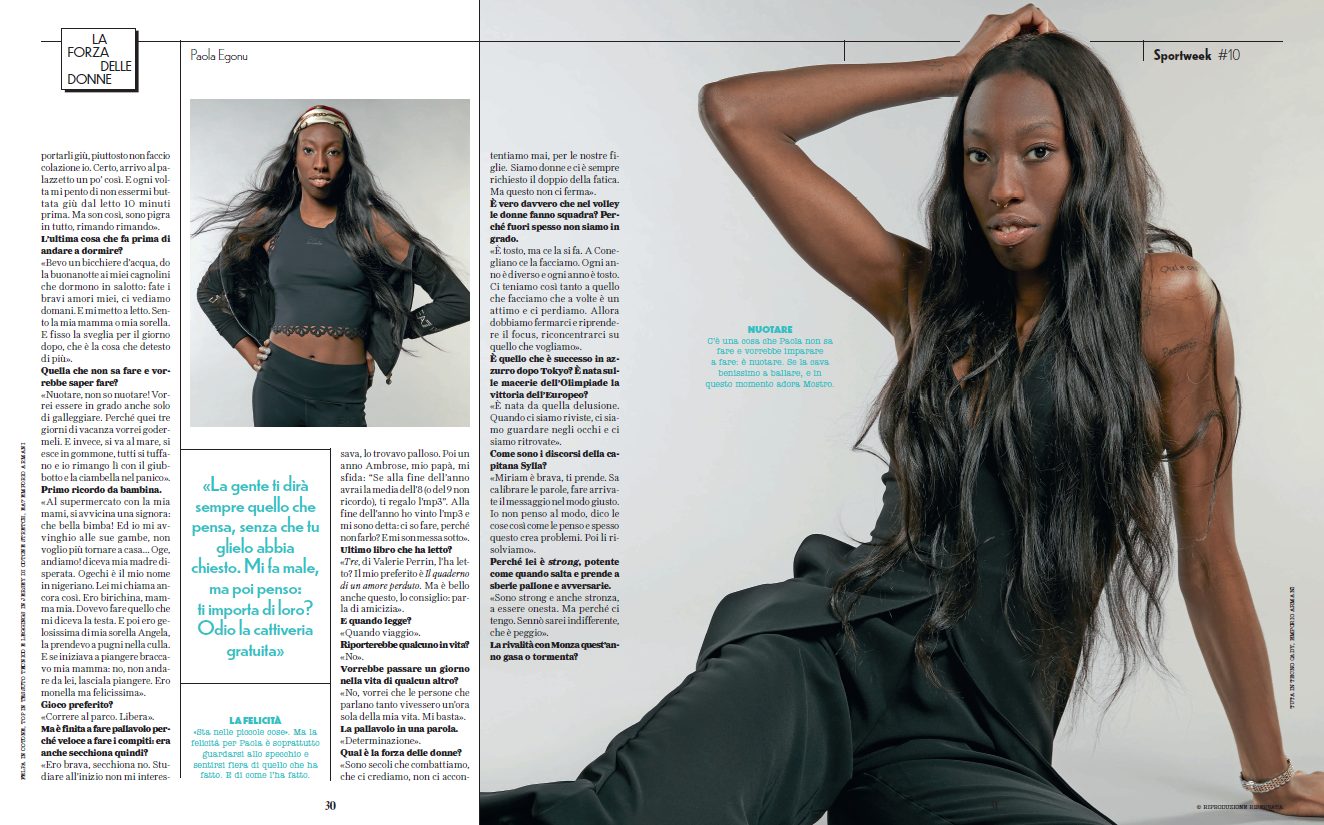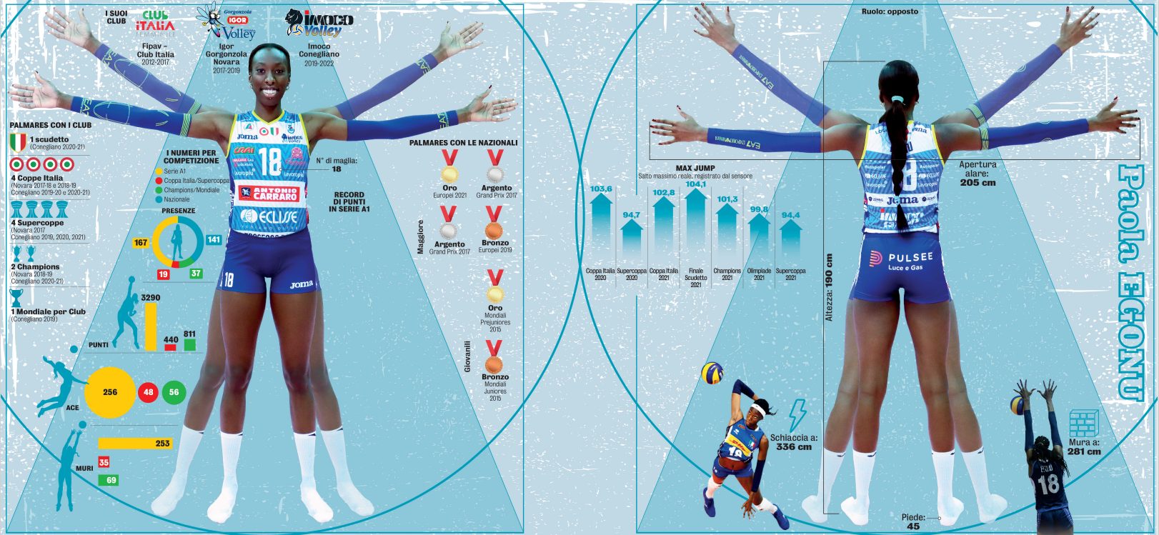 Fuoriclasse mondiale della pallavolo, opposto di Vero Volley Milano, leader di tutte le sue tre ex-squadre vincitrici della CEV Champions League, campionessa del mondo 2019 con Imoco e d’Europa con la Nazionale italiana nel 2021. Fuori dal campo testimonial EA7 Emporio Armani, eletta Donna dell’anno da Repubblica (2019), doppiatrice italiana per il film Soul prodotto da Disney Pixar (2020), conduttrice de Le iene (2021), autrice del libro 18 segreti per diventare stelle edito da Il battello a vapore (2022), co-conduttrice della terza serata del Festival di Sanremo 2023: Paola Egonu è un’icona della società italiana.