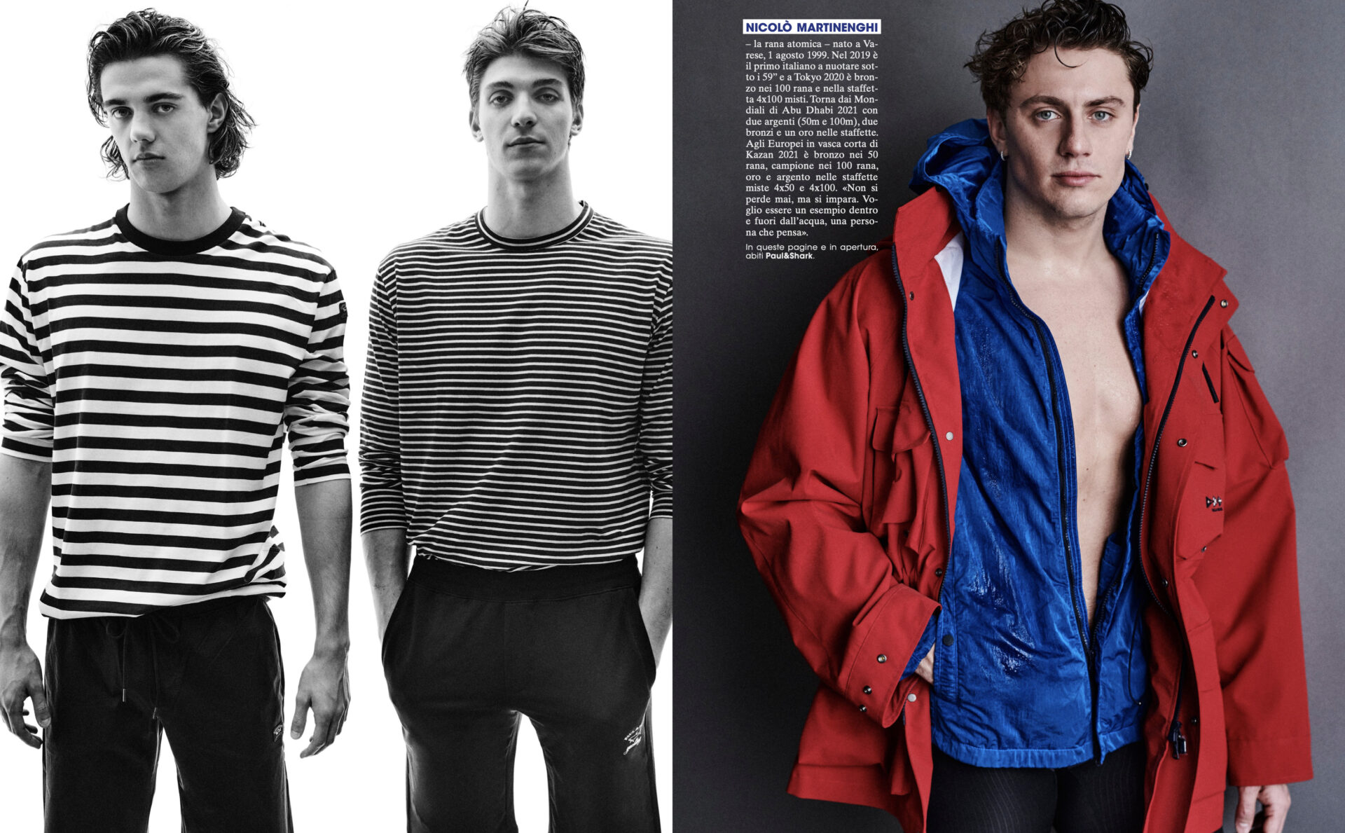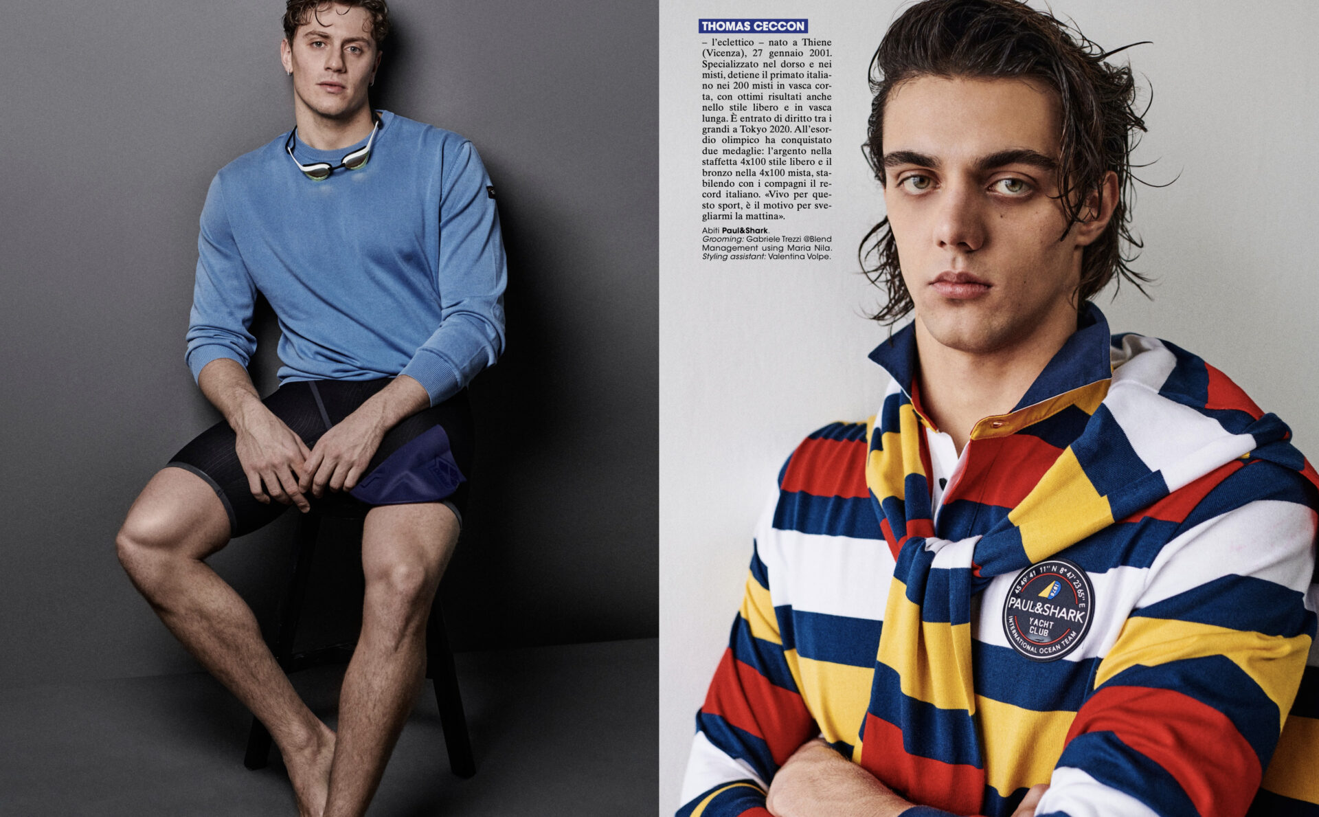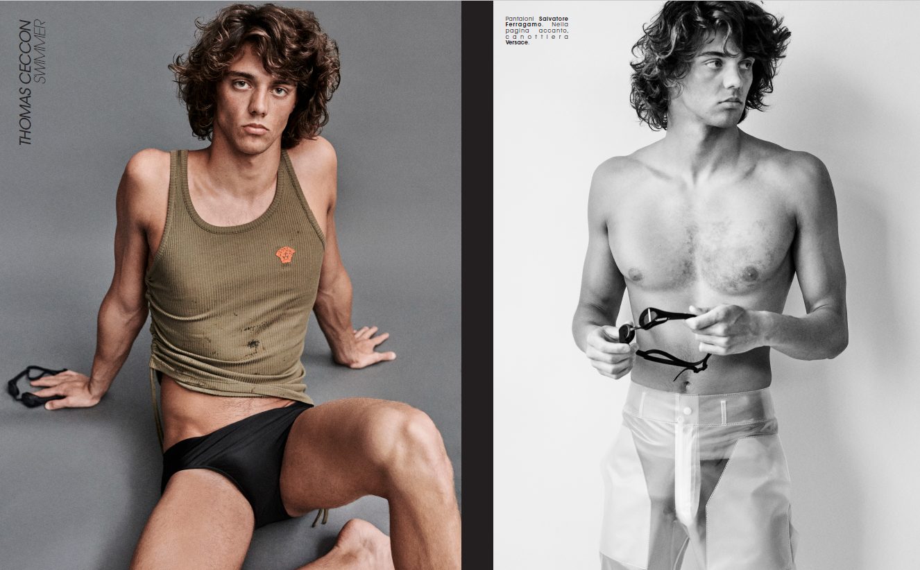 Swimming star Thomas Ceccon is the purest and most versatile talent in Italian sport. Born in 2001, Olympic medalist at the age of twenty (silver and bronze in relay), and now reigning world champion in the 50m butterfly and 100m backstroke world record holder with a time of 51.60 seconds. Young and handsome, Thomas is a cover athlete and sports lifestyle icon.